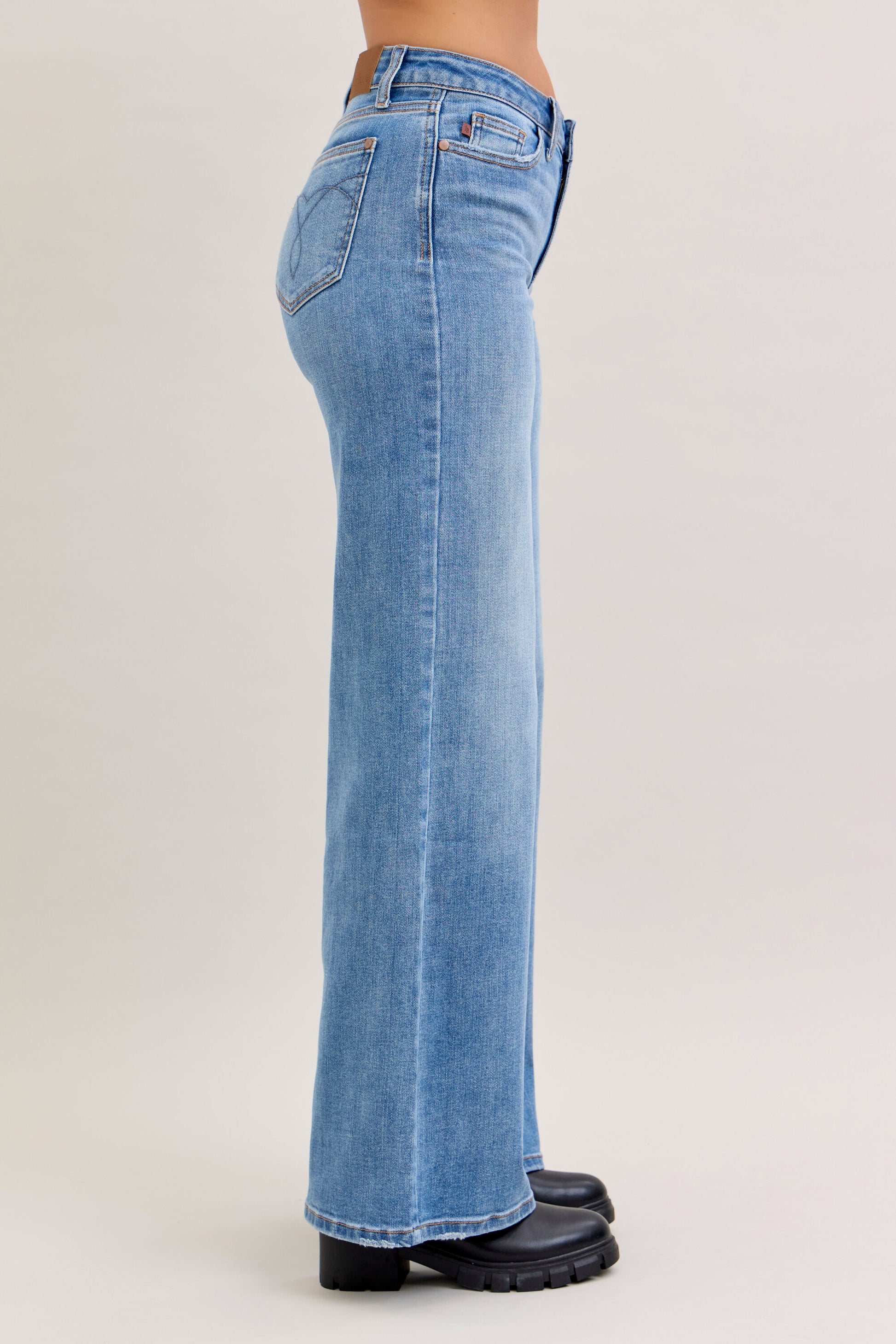 Mid rise comfort with wide leg opening. 32.5 inch inseam. Size down 1 from your normal size.