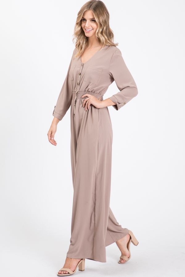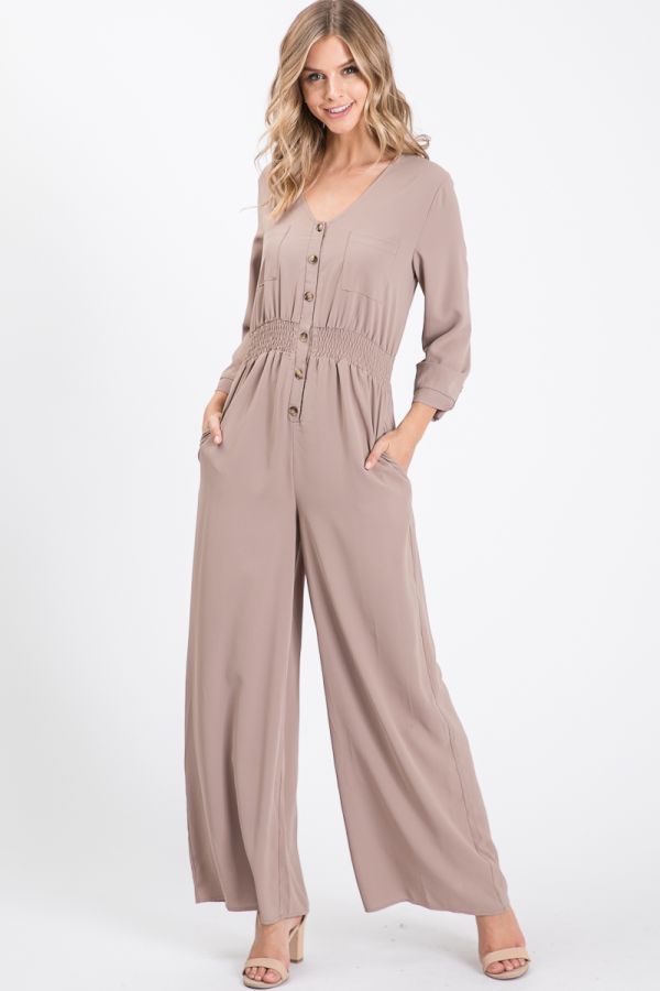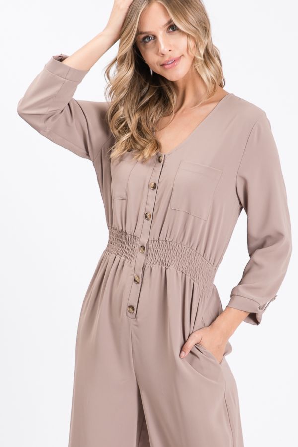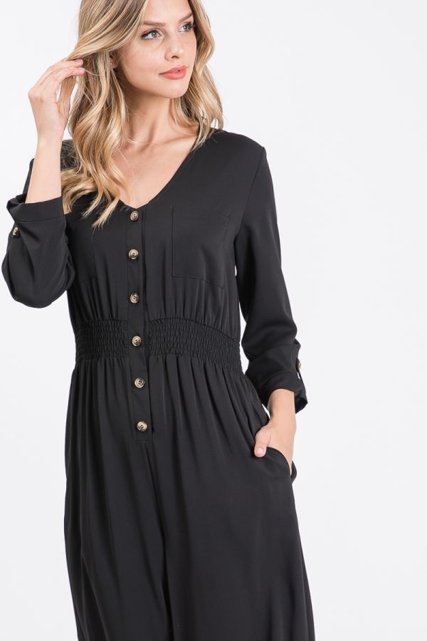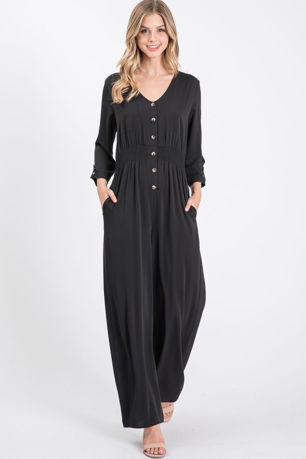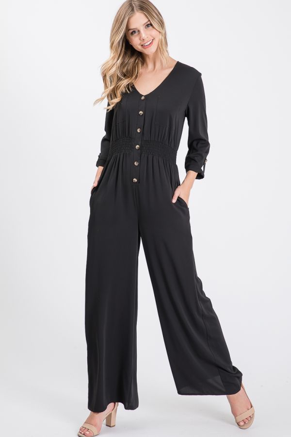 • Solid 3/4 sleeve button down jumpsuit with a smock waist and side pockets